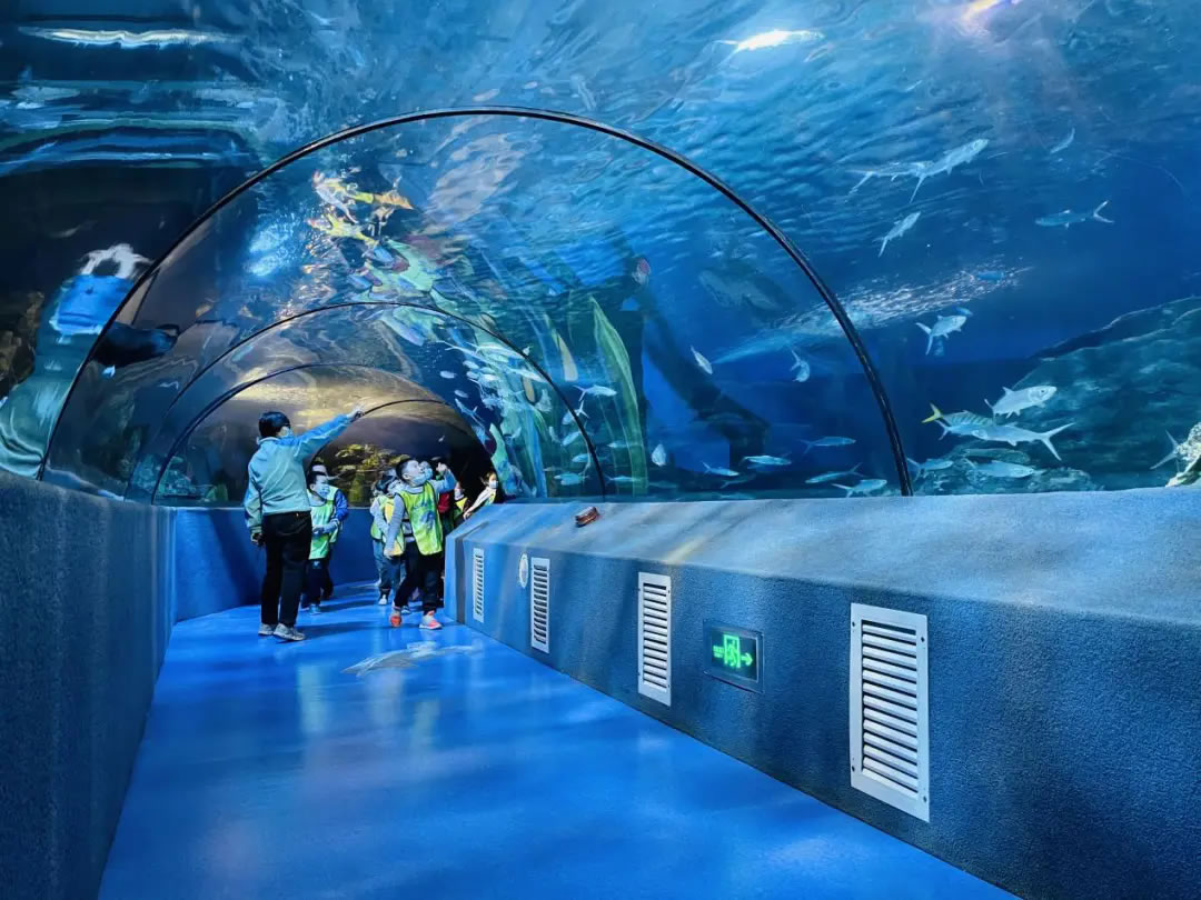- 海底隧道:80米長(zhǎng)、270度亞克力玻璃環(huán)繞,鯊魚(yú)、鰩魚(yú)從頭頂掠過(guò),搭配丁達(dá)爾效應(yīng)光影,形成震撼視覺(jué)體驗(yàn)。