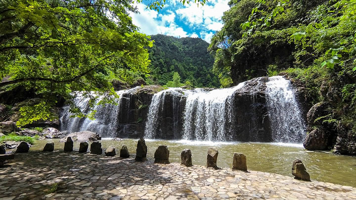 - 核心特色:以峽谷漂流為核心,融合自然奇觀(石林飛瀑、三仙巖、萬年古河床)、生態(tài)探險(高空溜索、飛躍山澗)及非遺文化(土著宴、刀山火海表演)。2022年新增漂流拓展區(qū)、浮橋等設施,被譽為“浙江第一漂流”。