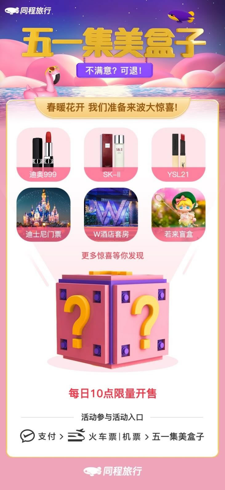“五一集美盒子”是同程旅行與超人氣潮玩品牌若來推出的五一聯(lián)名活動。通過定位“潮玩”、“美妝”兩大女性集中消費領域,推出了59.9元開盒活動,每個盒子包含一個實物潮玩和一件驚喜禮物,已于4月23日起在同程旅行小程序上線,驚喜禮物加持大牌美妝,也將4月30日加碼放送,每日10點準時開啟。
