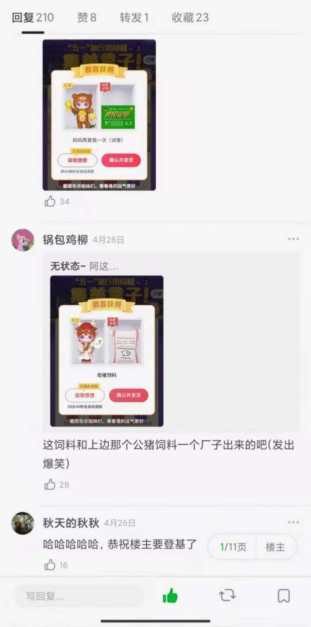 此外,集美盒子采用“套餐”形式。以潮玩集美盒子為例,購買一個可收獲蘇蕊小精靈和其他“神秘驚喜禮物”。開盒不僅有精美的潮玩,還能收獲火車票優(yōu)惠券及豐富多彩的神秘小驚喜。根據(jù)網(wǎng)友的不完全統(tǒng)計顯示,有不少活動參與者抽到了暢銷王牌護膚美妝產(chǎn)品,SKII神仙水、YSL小金條、完美日記口紅.....此外,“愛心煎蛋模具”、“手動壓面機”、“車載CD”等小禮物也十分引人注目。其結果的趣味性,在豆瓣、抖音、微博等自媒體平臺引起不少熱議跟風。下面是網(wǎng)友曬出來的一些驚喜獎品: