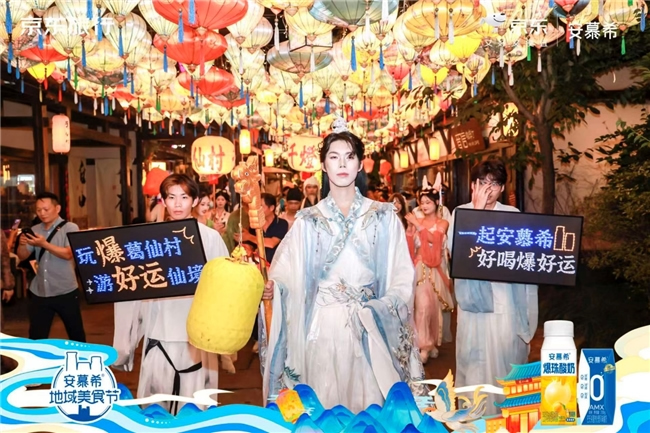 與景區(qū)千燈會(huì)深度合作,定制安慕希主題花燈共同組成巡游方陣。由好運(yùn)仙官們手持花燈引領(lǐng)巡游,形成"品牌-文化-游客"三方共創(chuàng)的流動(dòng)盛景。