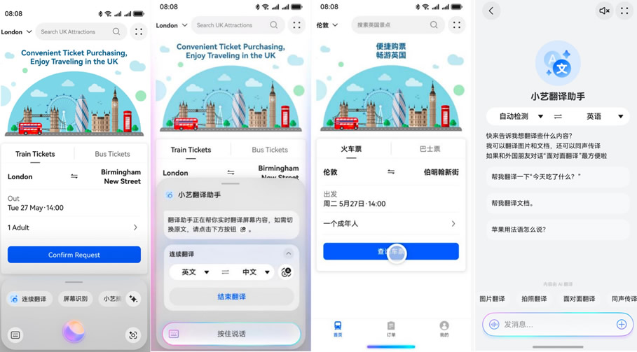 當(dāng)然,小藝的能力遠(yuǎn)不止于此。海外出行時,用戶翻閱外文網(wǎng)站或使用外文App,只需長按屏幕底部小藝導(dǎo)航條,點(diǎn)擊“連續(xù)翻譯”,或直接喚醒小藝后說“連續(xù)翻譯”,即可體驗(yàn)邊瀏覽邊翻譯的效果。當(dāng)需要與外國友人進(jìn)行面對面溝通時,使用小藝的面對面翻譯幫你輕松應(yīng)對跨語言溝通場景;遇見不認(rèn)識的外文路牌、菜單,拍照發(fā)給小藝翻譯助手秒翻譯。