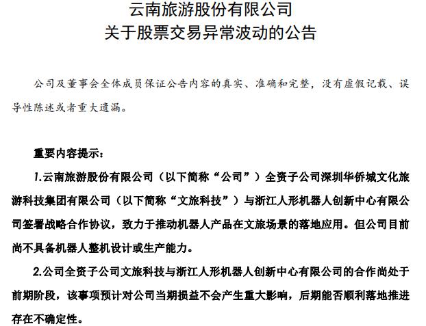 受到人形機(jī)器人概念的市場炒作影響,9月22日,股價(jià)長期低迷的云南旅游已經(jīng)收獲4連板,9月以來股價(jià)漲幅超55%。但根據(jù)公告,目前公司機(jī)器人相關(guān)合作尚處于前期階段,能否順利落地推進(jìn)存在不確定性。