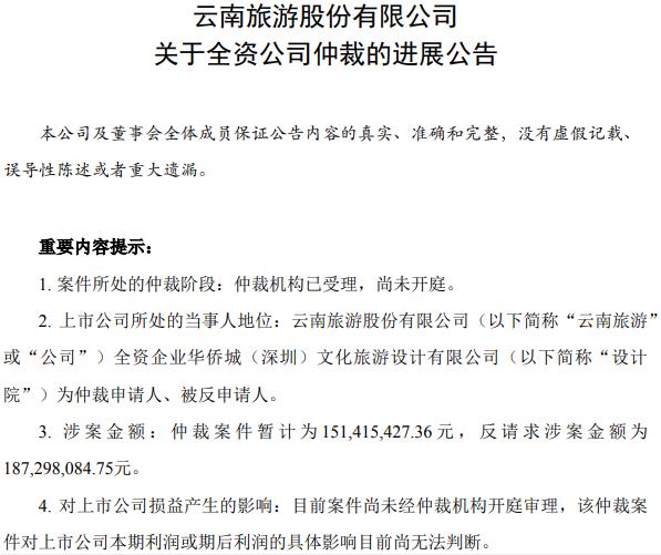 公司在今年2月發(fā)布公告,海力控股集團(tuán)有限公司與公司的全資公司云南旅游汽車有限公司所屬全資公司云南云旅交通投資開發(fā)有限公司發(fā)生合同履行糾紛,海力控股就該合同糾紛向昆明市中級人民法院提起訴訟。因云旅交投認(rèn)為海力控股存在違約,對案件提起反訴。近日,公司收到昆明中院出具的《民事判決書》,判決由云南云旅交通投資開發(fā)有限公司支付海力控股集團(tuán)有限公司工程款1.18億元及預(yù)期利息等。
