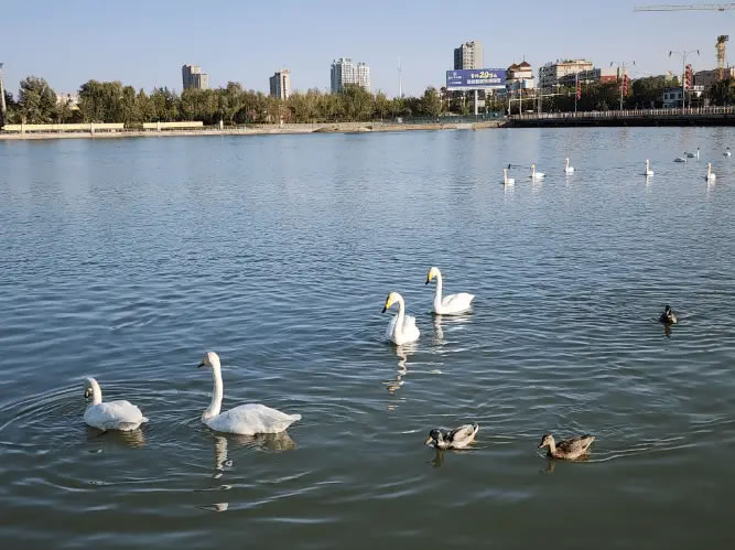 近日,一群野生白天鵝現(xiàn)身新疆庫爾勒市杜鵑河彭加木雕像附近水域。它們宛如久違歸家的“老友”,在水中歡快嬉戲,這也是今年首批來庫爾勒越冬的天鵝。天鵝如約而至,吸引了不少市民和游客駐足欣賞拍照,為梨城的秋天增添了一道迷人的風景,也為節(jié)日增添了一份喜慶的氛圍。