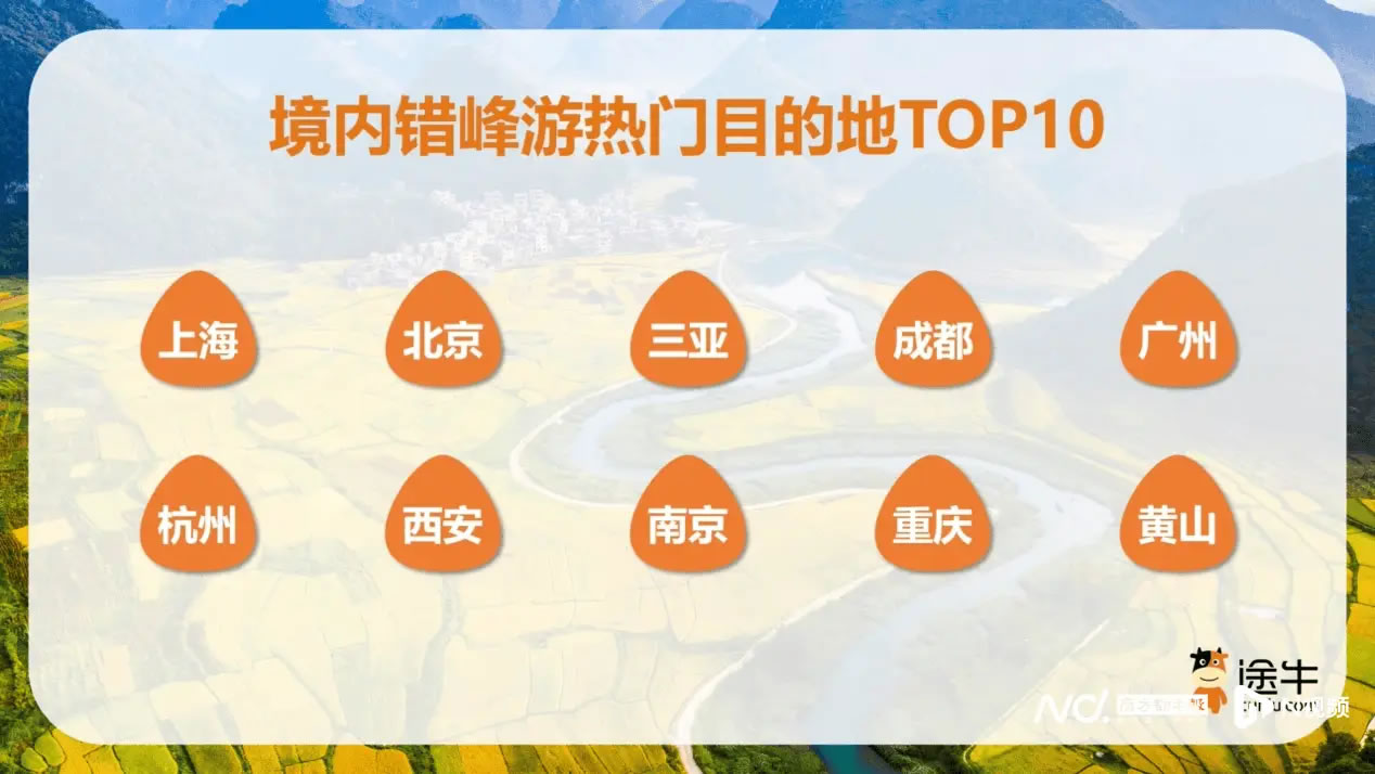 境內(nèi)錯峰游仍是多數(shù)游客的首選,途牛平臺上境內(nèi)出游人次占比超過70%。熱門目的地包括上海、北京、三亞、成都、廣州、杭州、西安、南京、重慶、黃山等地。