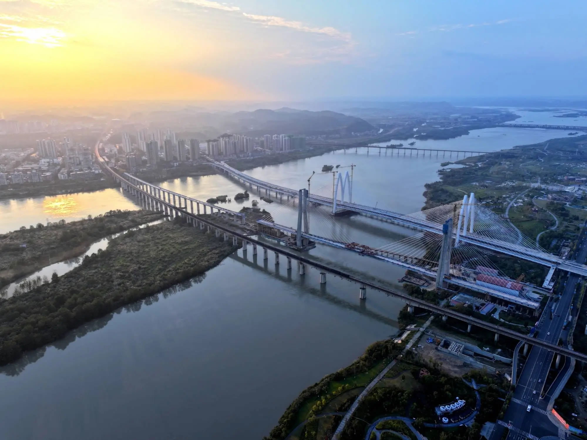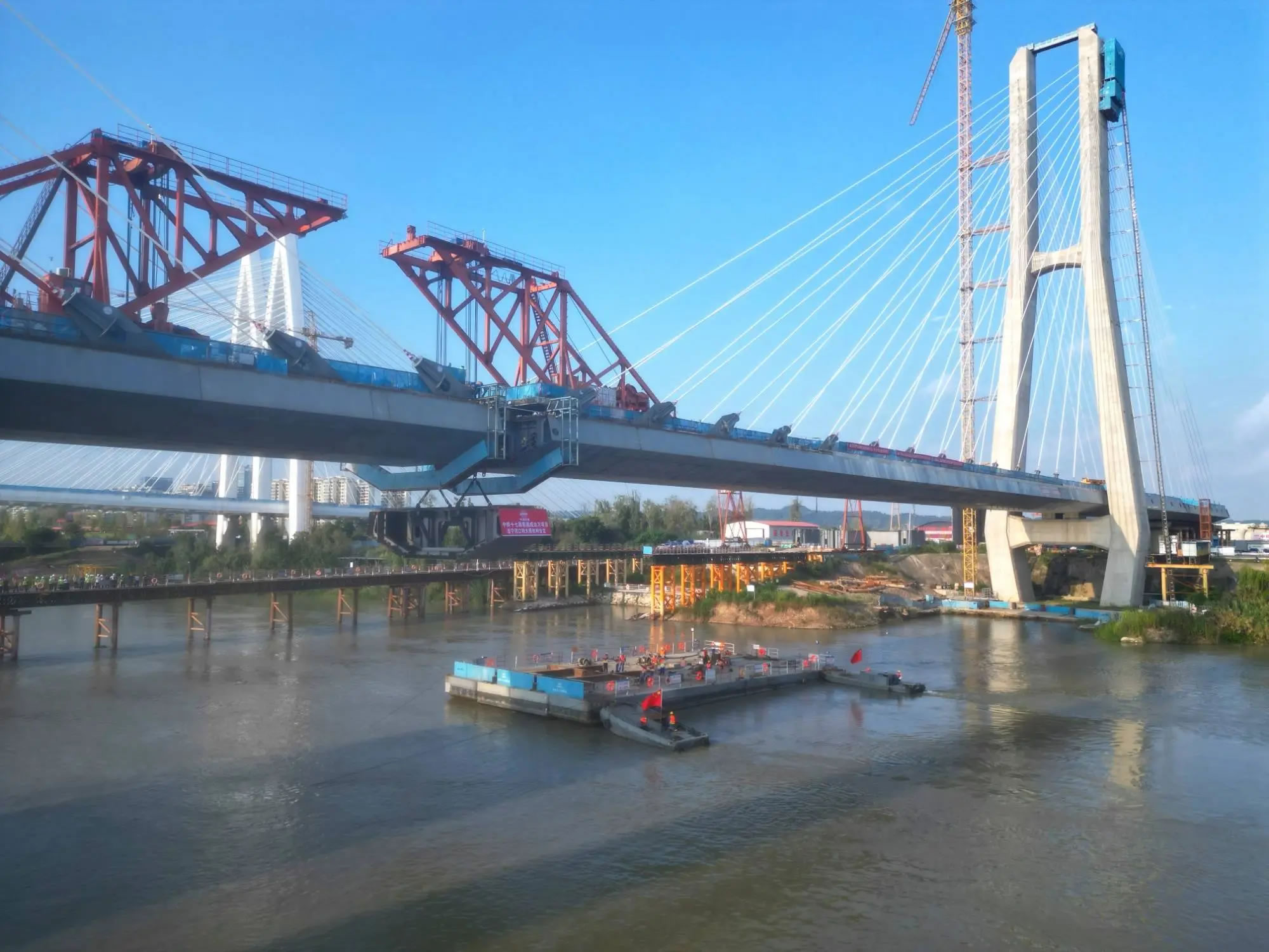 據(jù)中鐵十七局成達(dá)萬高鐵項(xiàng)目二工區(qū)總工程師單立國介紹,由于大橋橫跨涪江,施工團(tuán)隊(duì)創(chuàng)新采用“浮運(yùn)+橋面吊裝”方案,先將鋼箱梁通過浮箱從碼頭運(yùn)輸至江心指定位置,再運(yùn)用150噸橋面吊機(jī)進(jìn)行精準(zhǔn)提升。為確保合龍精準(zhǔn)可控,項(xiàng)目團(tuán)隊(duì)提前謀劃、周密部署。針對(duì)大跨度斜拉橋合龍段受力復(fù)雜、溫度變形敏感、精度控制要求高等技術(shù)難點(diǎn),團(tuán)隊(duì)選擇夜間“溫度低、溫差小”時(shí)段進(jìn)行合龍,有效減少溫度變化引起的結(jié)構(gòu)變形,并通過線形監(jiān)控、勁性鎖定等關(guān)鍵技術(shù)措施,最終將線形精度控制在毫米級(jí)范圍,實(shí)現(xiàn)高質(zhì)量合龍。