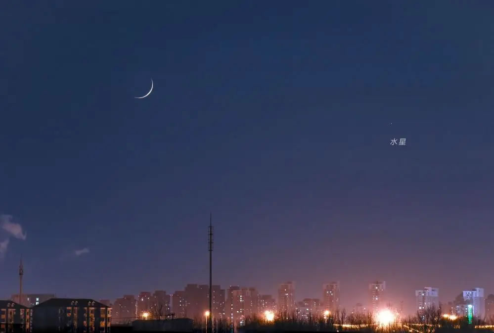 23日21時(shí),火星合月;24日零時(shí),水星合月。23日日落時(shí)分,在西南方同一片天區(qū),火星、水星和蛾眉月會近距離“相遇”并形成“雙星拱月”之勢,其中,火星的地平高度最高,水星其次,蛾眉月最低。