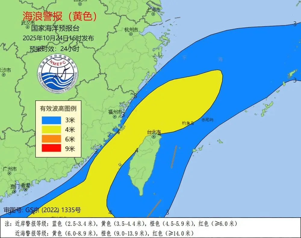 受強冷空氣的影響,預(yù)計10月24日下午到25日下午,東海南部、臺灣海峽將出現(xiàn)3米到5米的大浪到巨浪;福建近岸海域?qū)⒊霈F(xiàn)2.5米到3.8米的大浪,該近岸海域海浪預(yù)警級別為黃色,浙江南部近岸海域?qū)⒊霈F(xiàn)2米到3米的中浪到大浪,該近岸海域海浪預(yù)警級別為藍色。