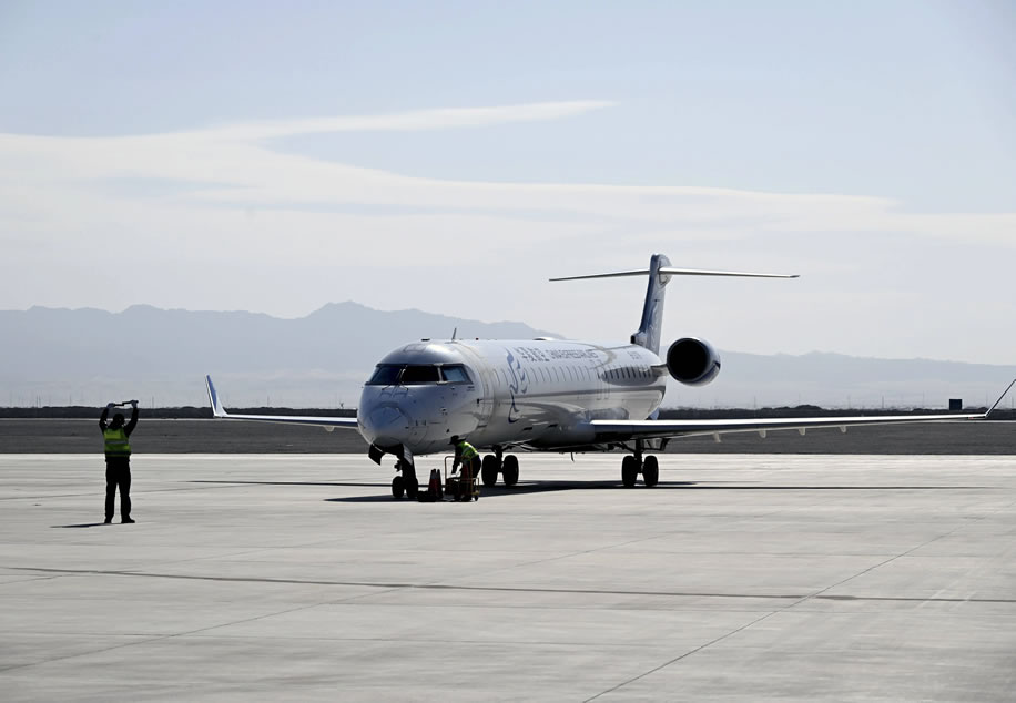 10月26日,敦煌至哈密冬春航季首航航班降落在敦煌莫高國際機(jī)場。 新華社發(fā)(張曉亮攝)