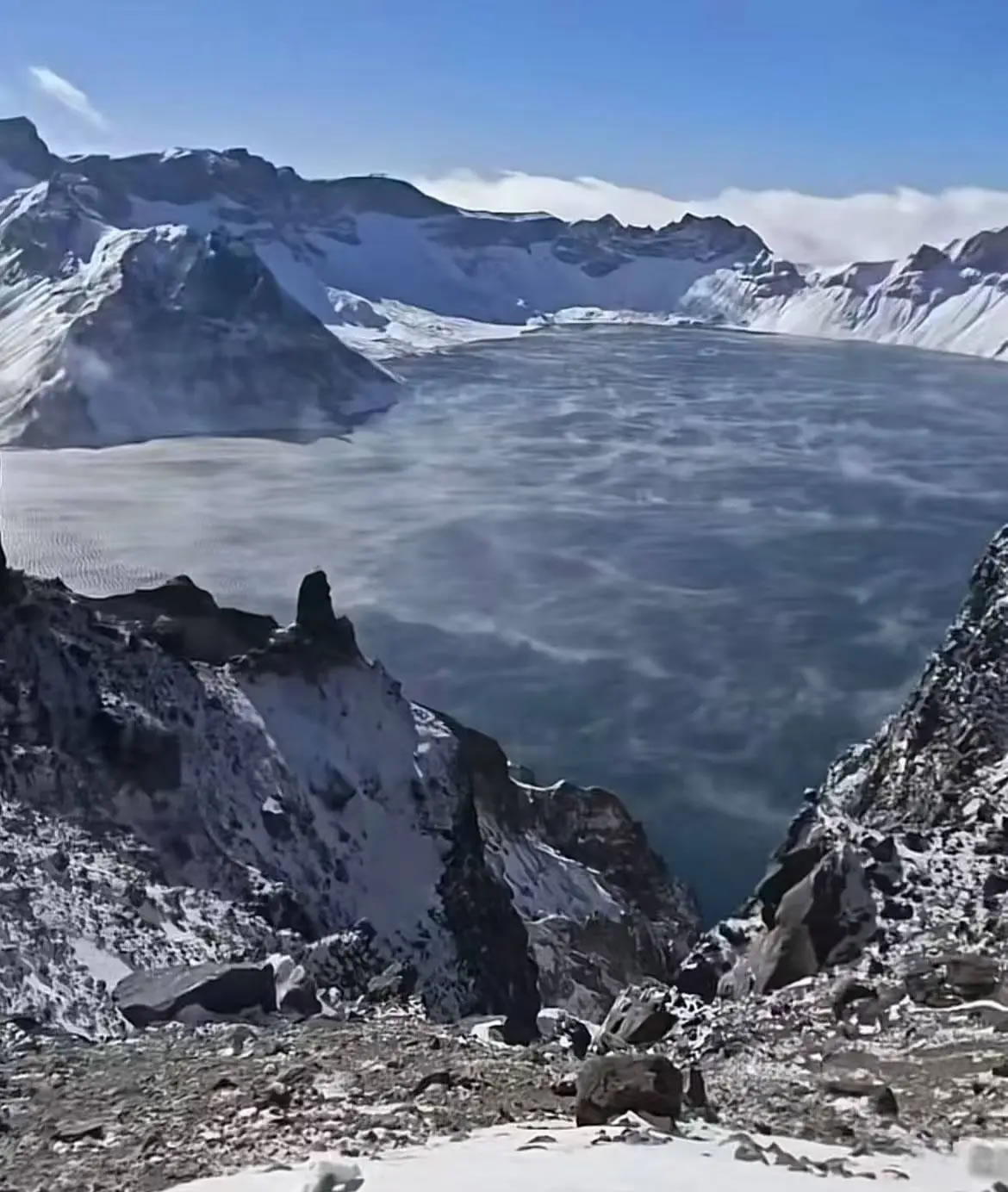 長白山景區(qū)的一位導(dǎo)游晚晚(化名)當(dāng)天也目睹了“海浩”的奇觀。10月20日上午9點(diǎn)左右,她跟隨景區(qū)工作人員前往天池附近清理道路積雪,來到北坡一觀景臺處時,看到在大風(fēng)吹拂下,凝結(jié)的水蒸氣正貼著天池的水面擴(kuò)散、飄動。