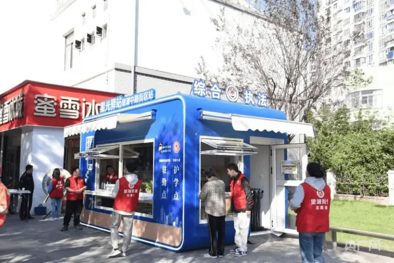 作為街區(qū)重要的“便民樞紐”,星光驛站功能定位清晰明確:面向戶外勞動者,這里是一座“能量補給站”,免費提供飲水、熱飯、充電等基礎服務,驅散奔忙的疲憊;對于周邊居民,它是一處“暖心港灣”,常態(tài)化開展義診、義剪等志愿服務,讓便利直達身邊;針對沿街商戶,驛站則是一個“助力平臺”,及時更新政策手冊、提供證照辦理咨詢,助力經營發(fā)展。