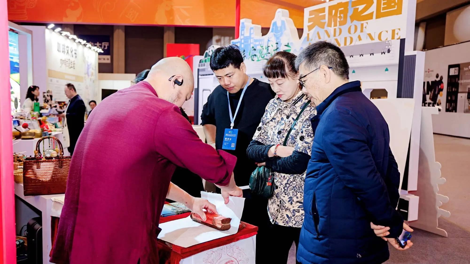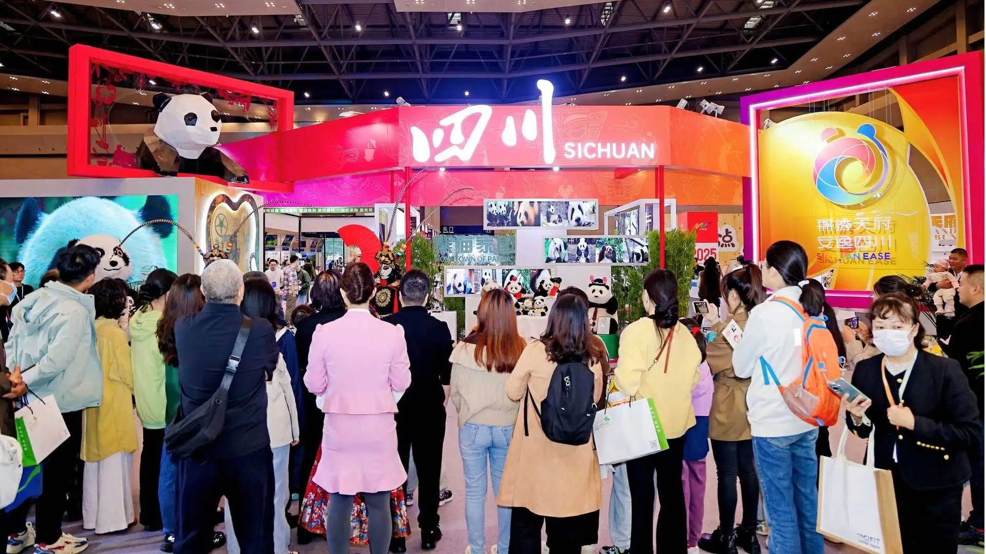 本次四川展臺位于展會核心區(qū)域,圍繞熊貓家園、古蜀文明、世界級旅游風(fēng)景道等主題打造展區(qū)。現(xiàn)場不僅有諸葛羽扇綸巾杯套組等文創(chuàng)產(chǎn)品、缽缽雞等天府美食展示,宜賓面塑、長寧竹編等非遺活態(tài)體驗,還通過川劇變臉表演、“安逸熊貓”人偶巡游營造沉浸式氛圍。同時,線下文旅咨詢區(qū)提供線路與政策解讀,百萬粉絲達人巡館直播、“安逸直播間”系列活動同步開展,實現(xiàn)“線下體驗+線上云看展”雙向聯(lián)動。