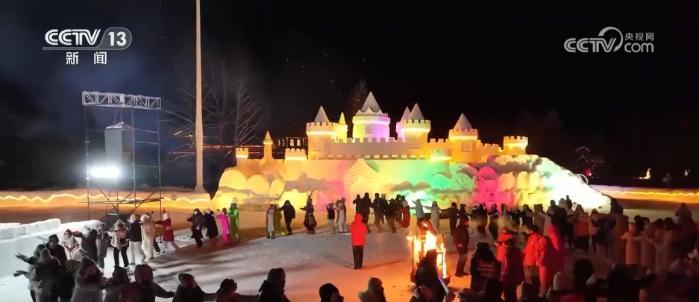 夜幕下的漠河市北極村被燈光點亮,惟妙惟肖的雪雕有了不一樣的顏色。在小廣場上,天南地北的游客聚在一起攜手起舞,并用鏡頭記錄下浪漫的煙火。為滿足滑雪愛好者的需求,當?shù)匮﹫鼋衲晔状伍_放夜滑,并新增了雪道。